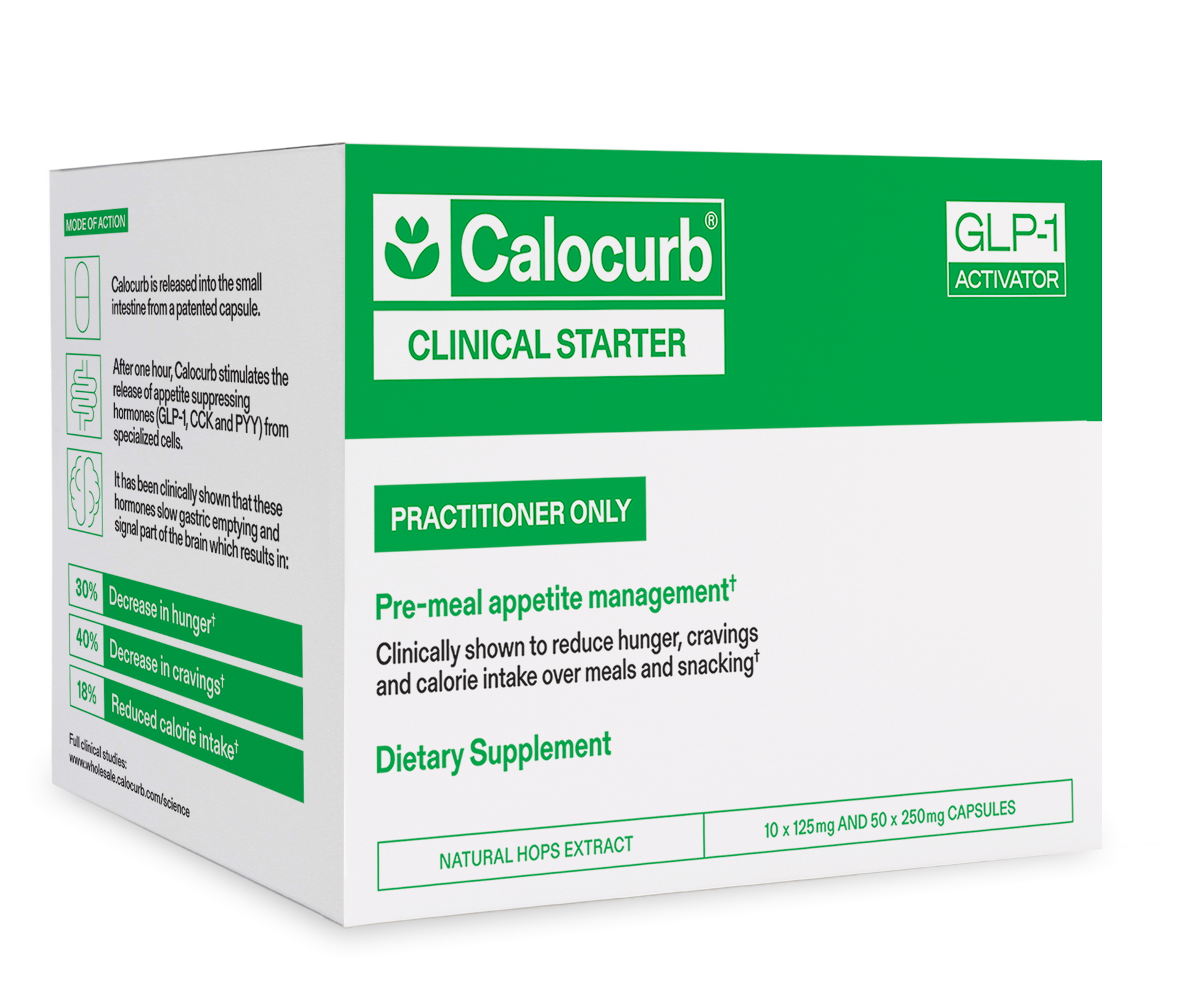 Calocurb® CLINICAL is a practitioner-exclusive supplement that supports appetite control by working with the body’s natural hormonal signals. It features Amarasate®, a clinically studied extract of New Zealand bitter hops, delivered in a delayed-release capsule designed to reach the small intestine where it activates bitter taste receptors. This triggers the release of key satiety hormones including GLP-1, CCK and PYY, which work together to significantly reduce hunger, cravings, and caloric intake. Fast-acting and plant-based, Calocurb® CLINICAL offers a targeted, science-driven approach to supporting healthy weight management.